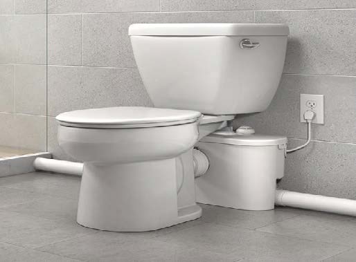 Complete upflush bathroom system with ADA toilet and 1/2 HP grinder pump. Install anywhere without breaking concrete or gravity drainage.